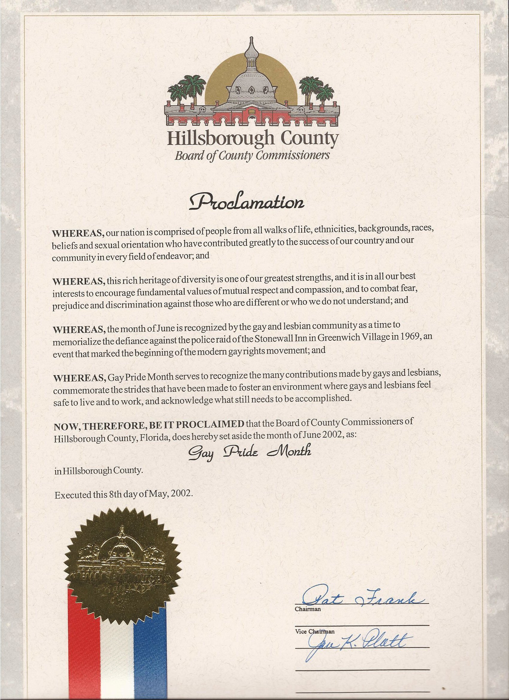 After a good laugh Joe said he had something to show us. From his big desk, he pulled out the Official Hillsborough County Proclamation, proclaiming June 2002 as Gay Pride Month. It was signed by Chairperson Pat Frank and Vice Chair Jan Platt. Fast forward to 2012 and still only 2 people, Commissioners Kevin Beckner & Les Miller, would sign a GaYBOR Days Proclamation.