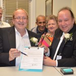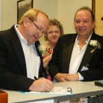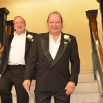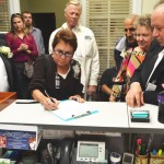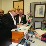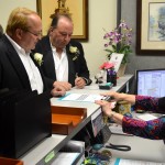 We are truly blessed to call our Family -Friends and our Friends -Family so invitations were sent out to everybody. We started the ceremonious day wearing tuxes and then onto a family lunch at one of our very favorite restaurants, The Laughing Cat. During lunch our 3 sisters from the Wisconsin gave Carrie a lace handkerchief that our Great Grandmother wore in her wedding and has been worn and carried by all family members since. We all rode the TECO Streetcar down to Old Tampa City Hall. Many more people were there to greet us and cheer us on. The Tampa City Clerks were very friendly and helpful. Our witnesses were Sister- Yvonne Yacoub, Friend- Judy B. Good and Tampa Mayor Bob Buckhorn. Carrie used the same pen that Mayor Bob Buckhorn signed Domestic Partnership Registry into law. After several minutes everything was done. The press were all there for photos and interviews.