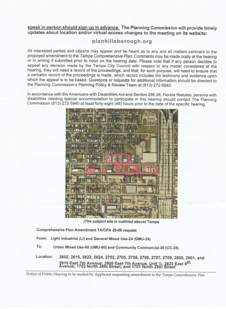 Residents, the Historic East Ybor and Gary Neighborhood Association (HEYGNA) has received notice of hearings in front of the Hillsborough County Planning Commission and city of Tampa City council to hear a proposed change of land use, initiated by a private party, for parcels located in South East Ybor and one located outside our boundary located just East of Ikea. The proposed change would change the use of the parcels from light industrial LI and general Mixed use M24 to Urban Mixed Use 60 or UMU-60 and in one of the to community Commercial 35 (CC-35). Please see dates of hearings and ways to participate in the pictures attached. The planning commission found the proposed changes inconsistent with the current plan.