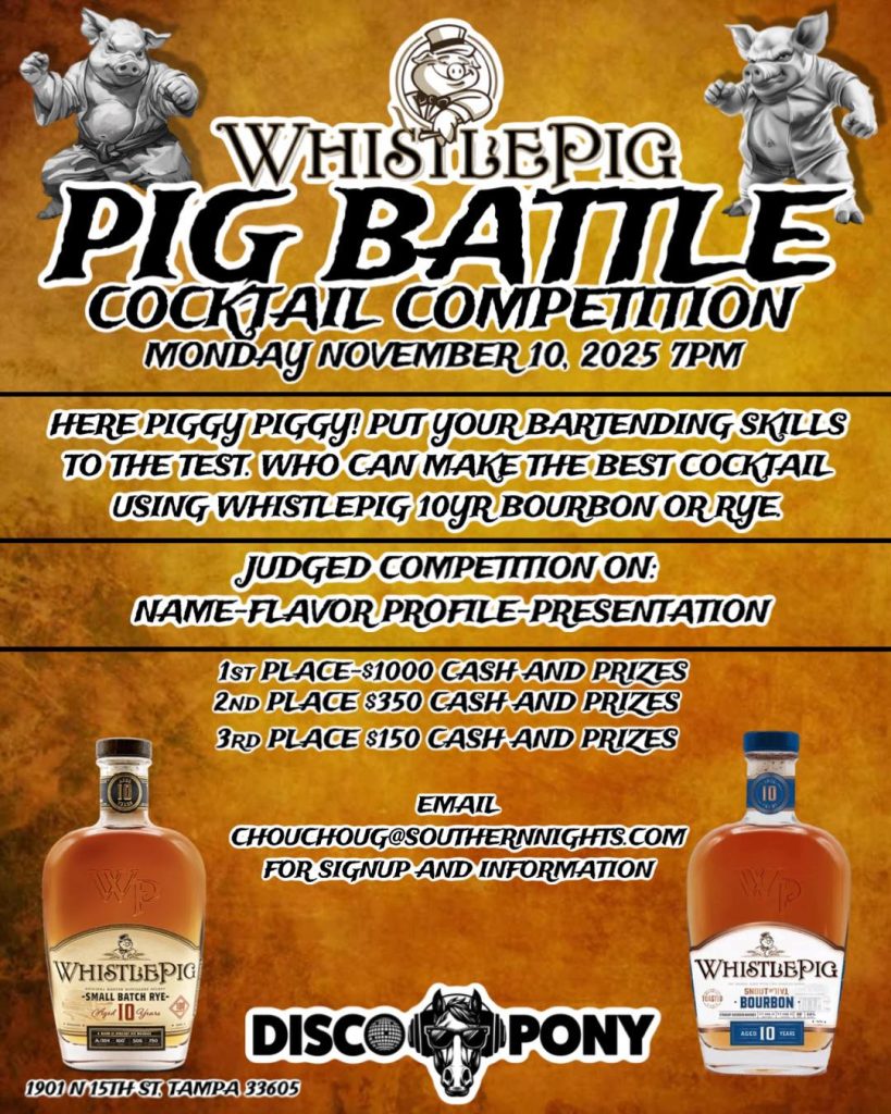 Alright guys Disco Pony is hosting the Whistle Pig Cocktail Competition Monday November 10 in Ybor. Stipulations are that your bar must order a case or more of the 10yr Whistle Pig Bourbon or Rye from SWS to be featured the whole month October at your establishment. Signup are for the first 20 people and orders will be checked with SWS. Contest rules and signup please email me at ChouChouG@SouthernNights.com